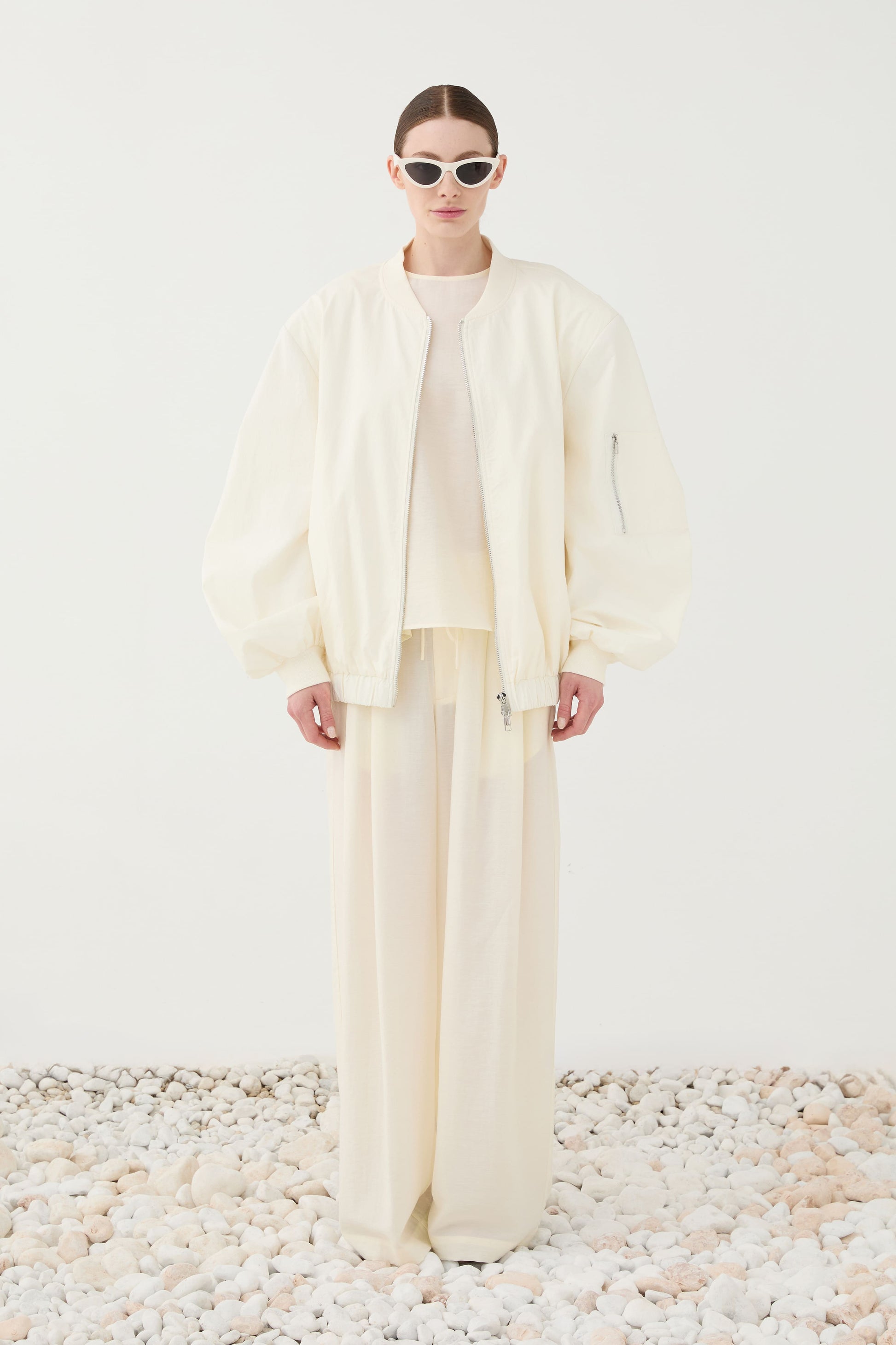 We zijn er niet verlegen om, bombers zijn onze favoriete jassen naast blazers ;) Deze topper mag dus niet ontbreken in de collectie. Deze oversized bomber in écru stof heeft een nonchalante look die iedere outfit net dat tikkeltje stoerder en toch vrouwelijk maakt. De jas is voorzien van een rits die in beide richtingen open kan, grote steekzakken, stoere ritszakjes op de mouw en een frons effect in de rug. Een echte must-have!