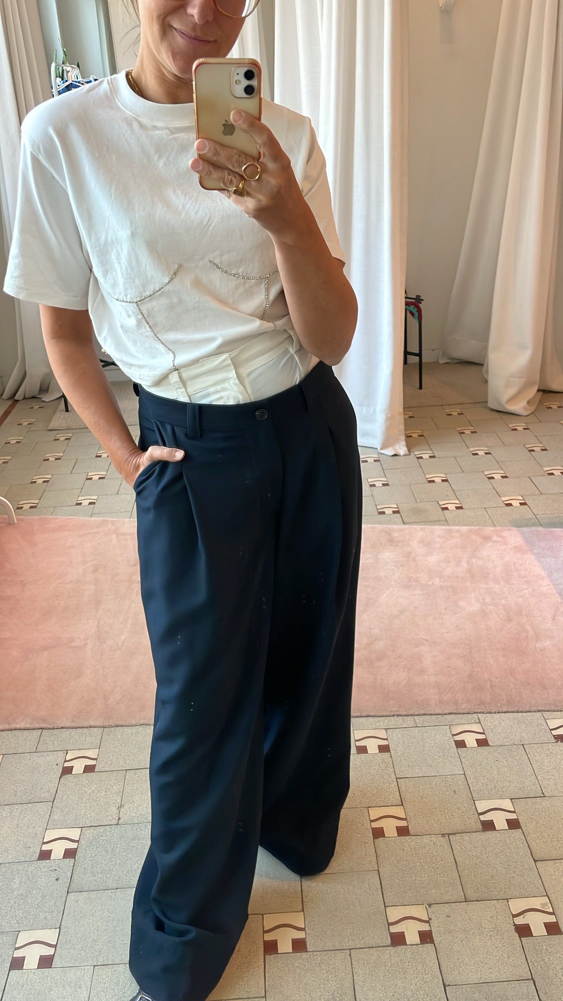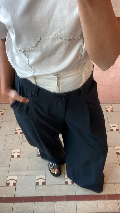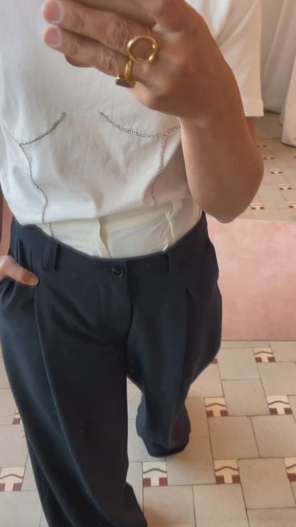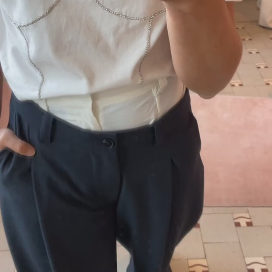 data-mce-fragment="1">Msut-have alert! Deze prachtige broek met trompe-l'oeuil effect smeekt er gewoon om zich te vervoegen bij jouw garderobe! De asymmetrische taillelijn geeft jouw look meteen een eigentijdse en nonchalante look. Combineer met eenvoudige items zodat alle aandacht naar de broek kan gaan. Gemaakt in een mooie soepelvallende stof, valt mooi wijd rond de benen en heeft onderaan een extra brede omslag.
