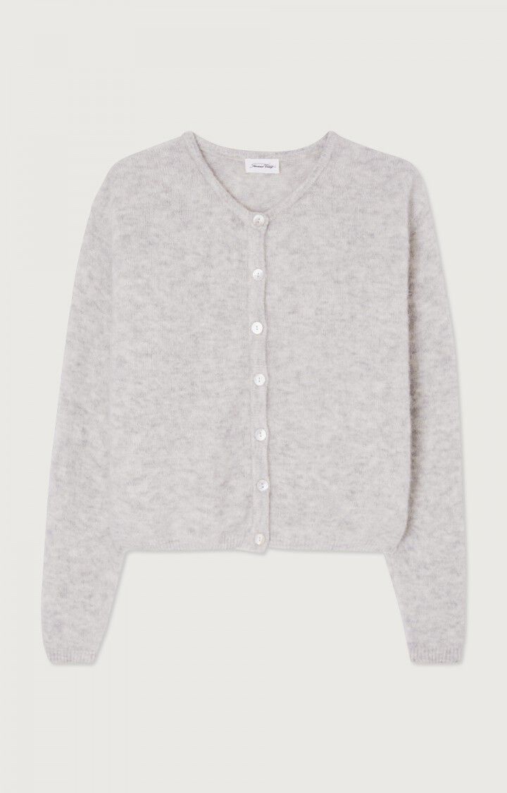 Fijngebreide cardigan in lichtgrijze kleur met subtiele spikkels. Valt mooi los en heeft een knoopsluiting.