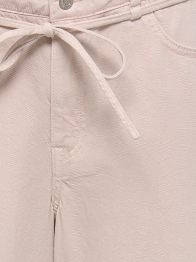 Onze bestselling jeansbroek in nieuwe lichtroze soepele denim met strik in de taille en baggy fit. Valt dus mooi los rond de benen. Heel leuk met een simpel T-shirtje en oversized blazer. Lengte 32.