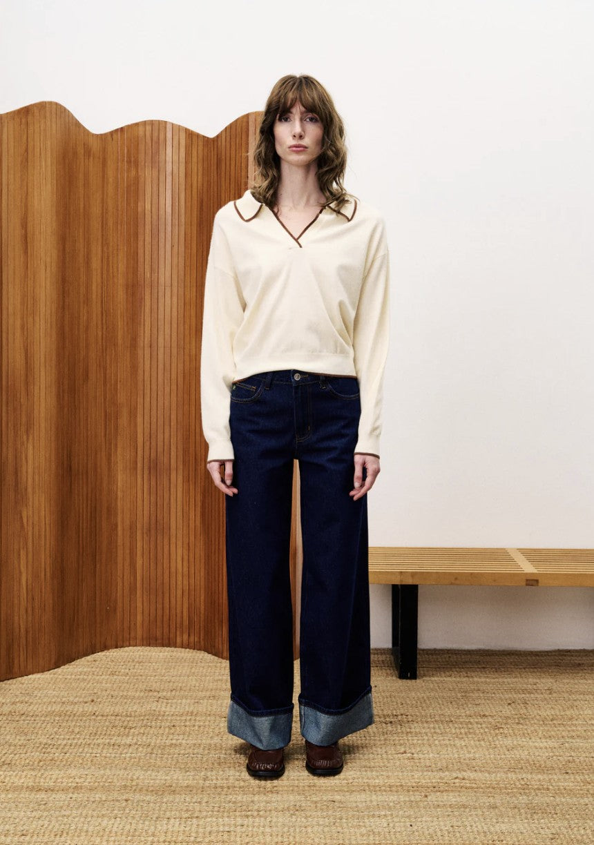 Heerlijk zacht polotruitje met fijne bruine boordjes. De ideale basic om eindeloos te combineren. Prikt absoluut niet op de huid, dus perfect als je een gevoeligere huid hebt.