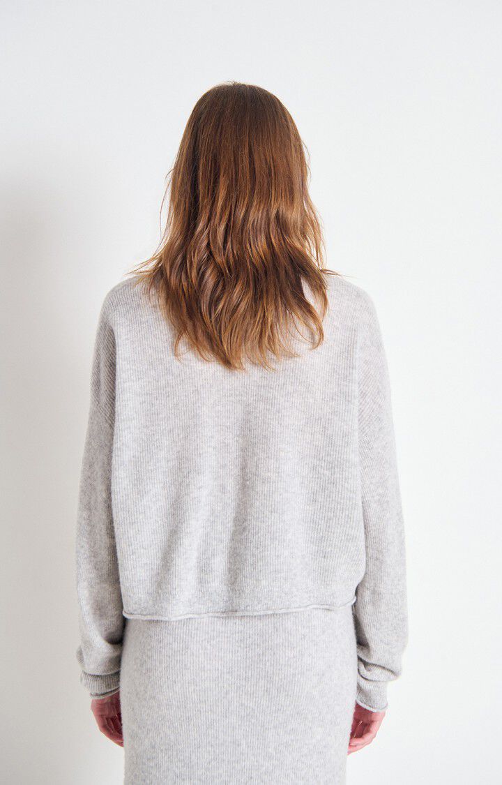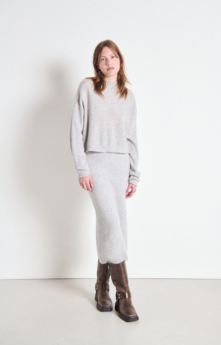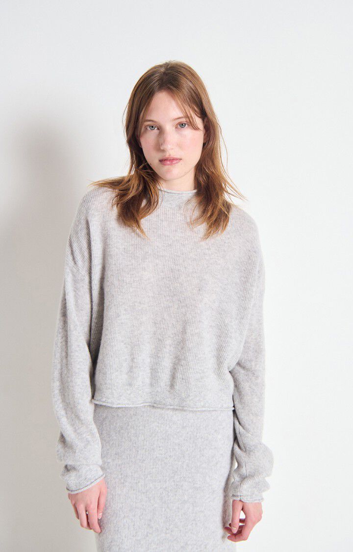 Zachte pull met geribde steek en ophoging aan de hals. Komt iets korter qua model en is ook leuk in set met de bijbehorende rok.
