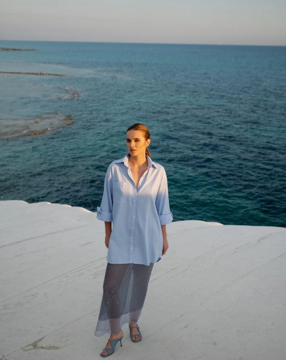 Een lange rok met een licht transparant design en pailletjes om een elegante look te creêren: kan zowel voor dagdagelijks met een oversized tee of met een stijlvolle bloes als feestlook.