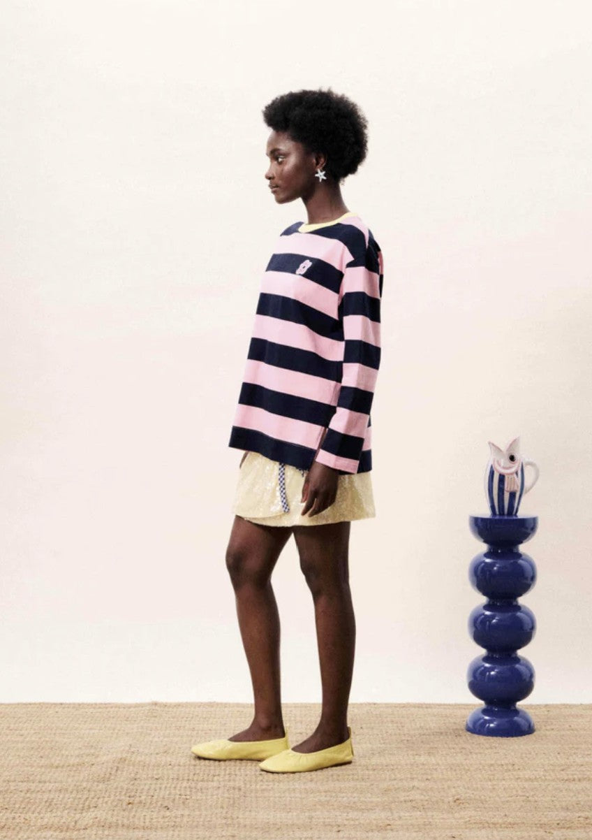 Galiana is vanaf nu onze favoriete metgezel voor het frisse tussenseizoen. Deze T-shirt met lange mouwen is gemaakt in een iets zwaardere jersey en is dus perfect om nu reeds te dragen op je favoriete denim. De roze streep, fris gele boord en geborduurd bloemetje geven deze basic een vrolijke touch.