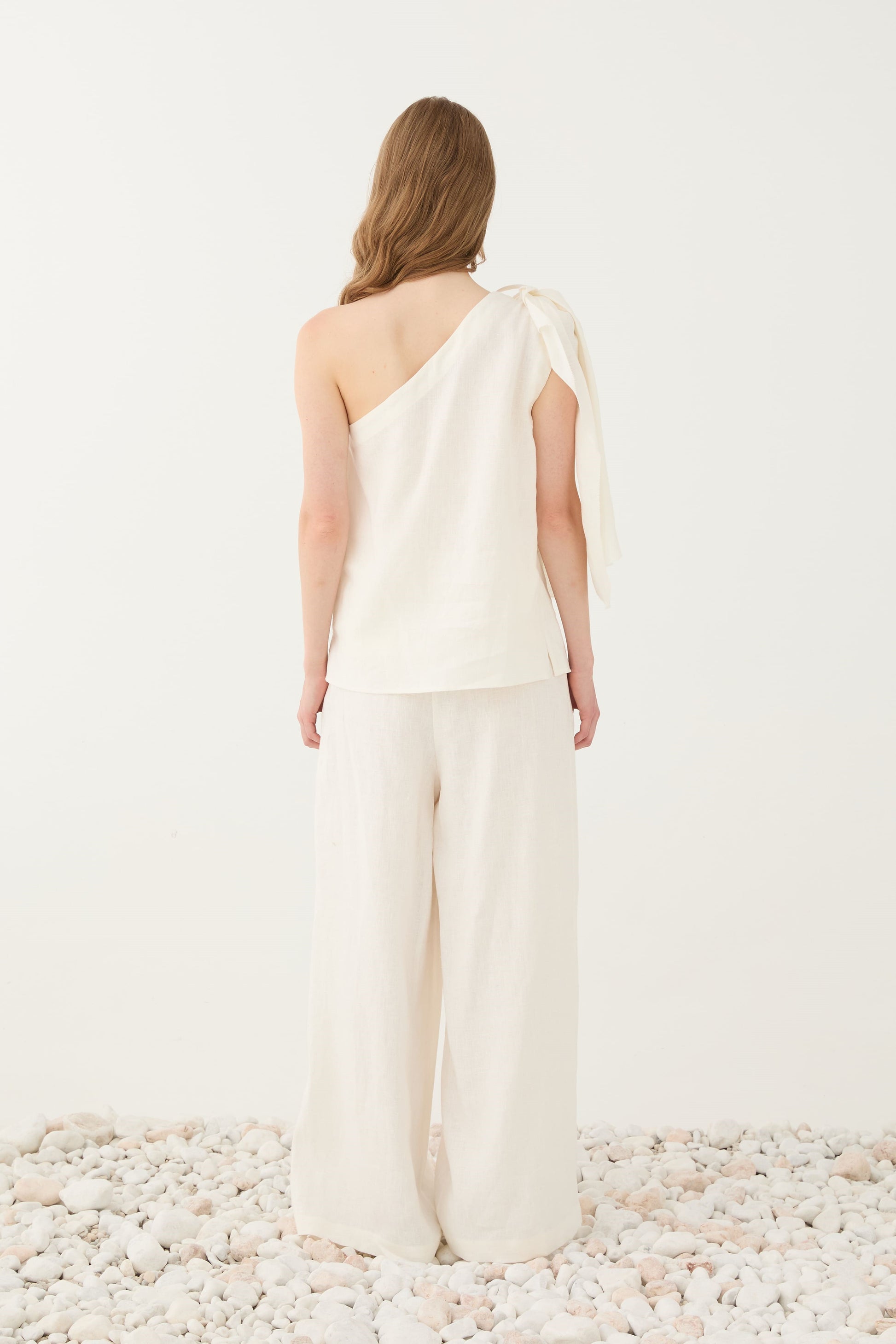 Deze prachtige linnen top is een one-shoulder model met een drapage effect langs de schouder. Dit drapage stukje zit vast met een drukknopje en kan er dus ook af. Valt mooi los rond het lichaam, kan je dus los dragen of intukken. Onder de arm zit een ritssluiting voor de top makkelijk aan en uit te kunnen doen.