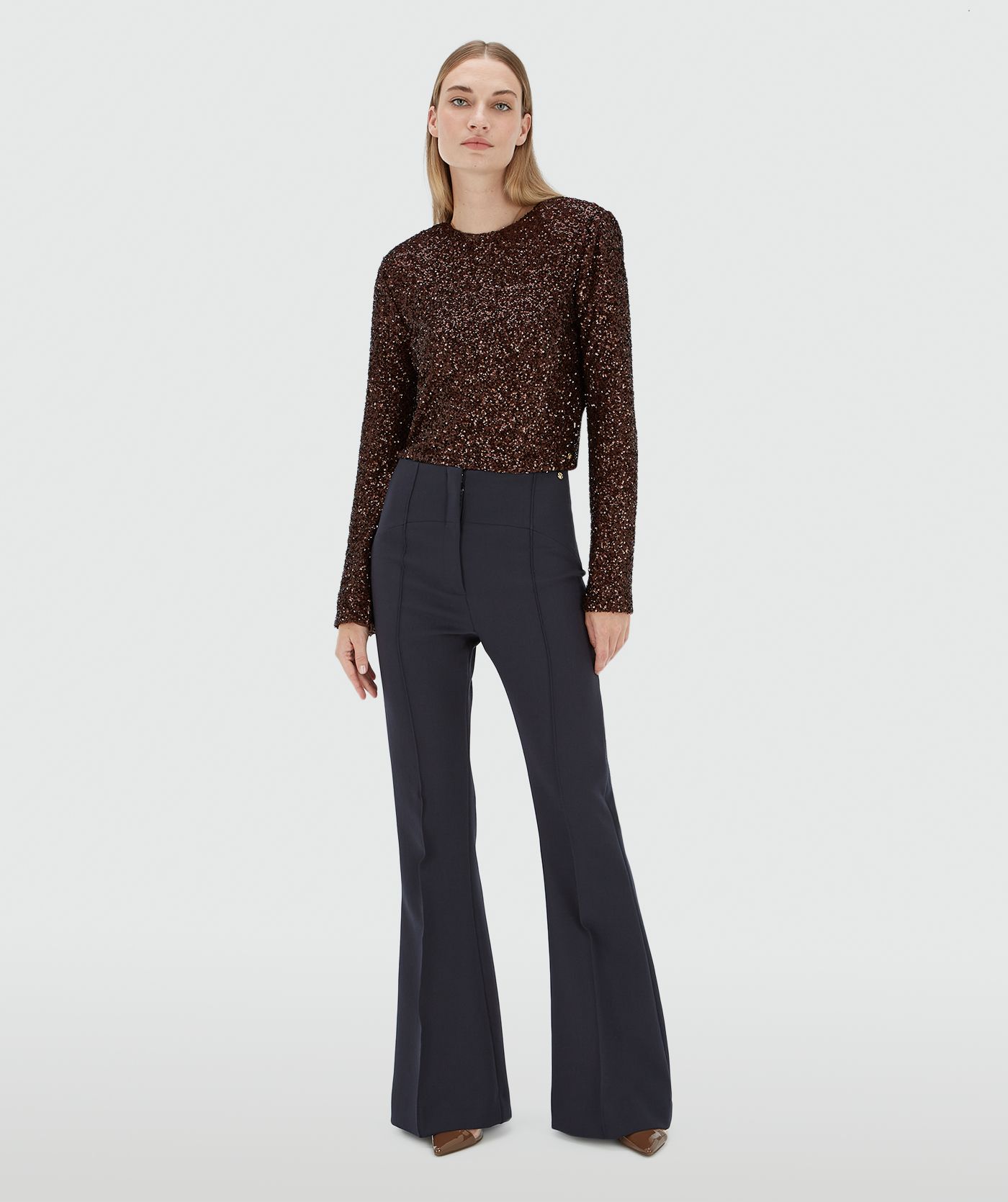 De Vivanna is gemaakt van een sprankelende sequin stof met stretch, wat zorgt voor een feestelijke uitstraling. Deze regular fit top heeft een klassieke ronde hals en lange mouwen, perfect voor een chique, maar toch draagbare look. Daarnaast is de pailletten top voorzien van subtiele schoudervullingen. Ga voor de complete set en combineer de top met de bijpassende Lonne rok voor een feestelijke gelegenheid. Of draag de top in combinatie met een zwarte pantalon of jeans voor een mooie avond look.